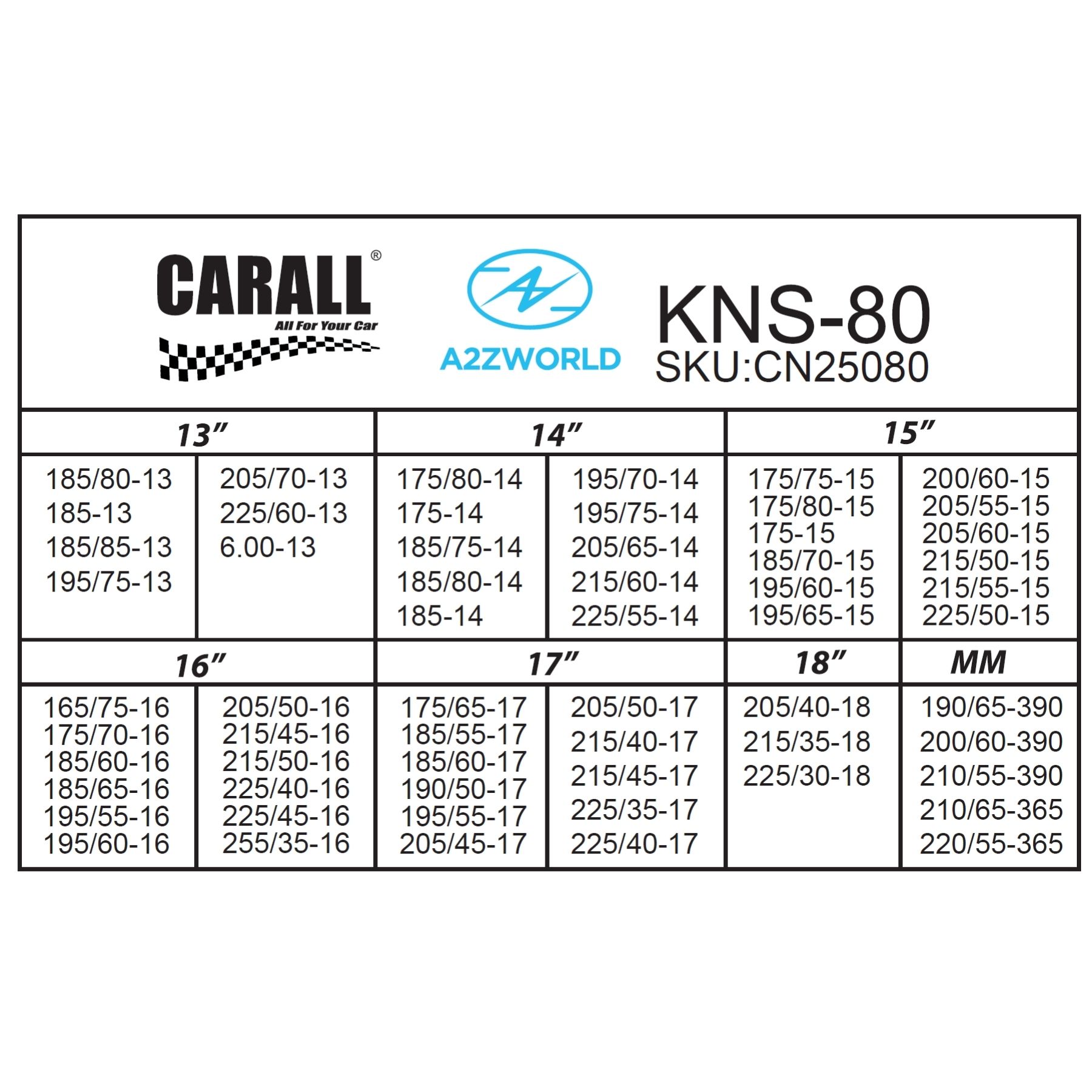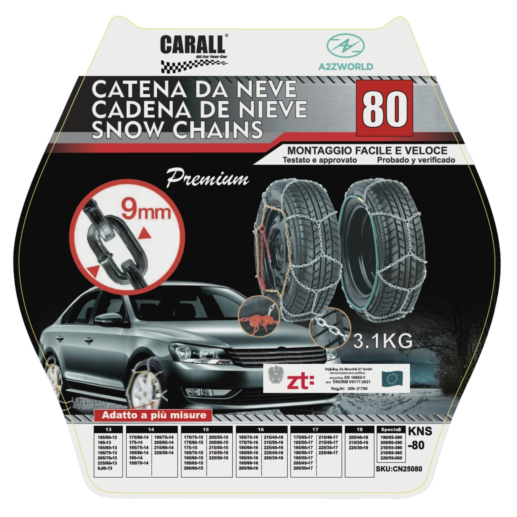 - Compatibilità per R15: 175/75 R15, 175/80 R15, 175 R15, 185/70 R15, 195/60 R15, 195/65 R15, 200/60 R15, 205/55 R15, 205/60 R15, 215/50 R15, 215/55 R15, 225/50 R15
