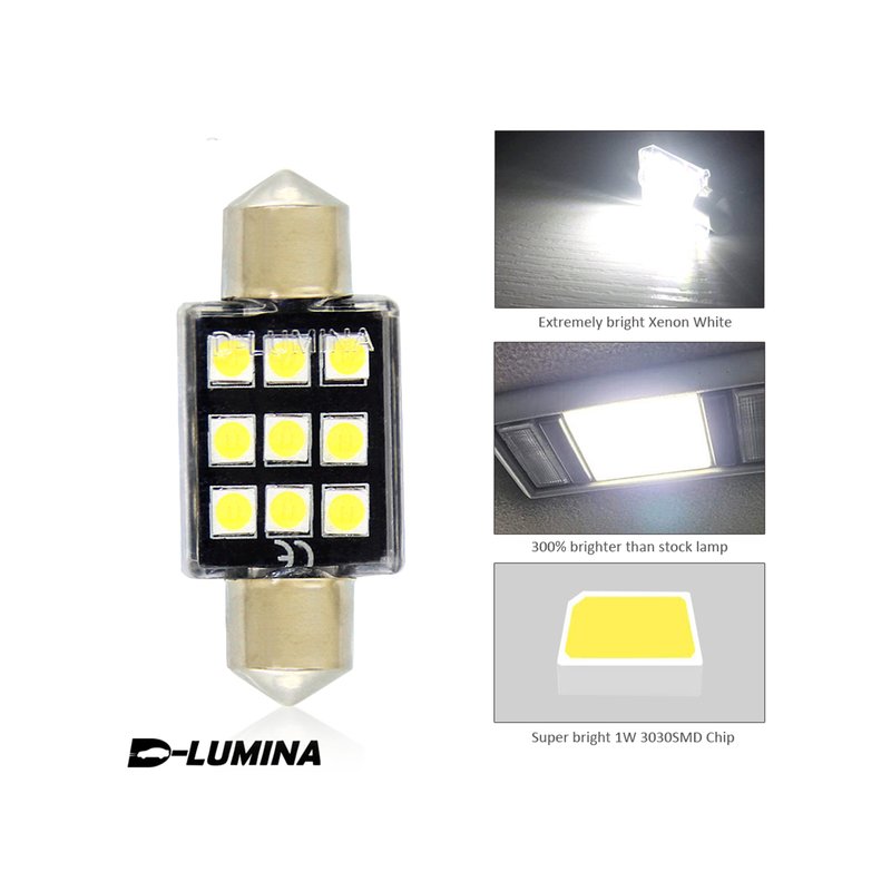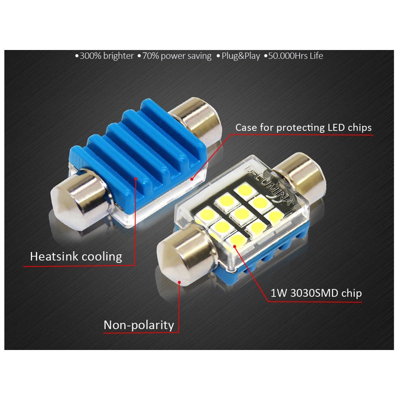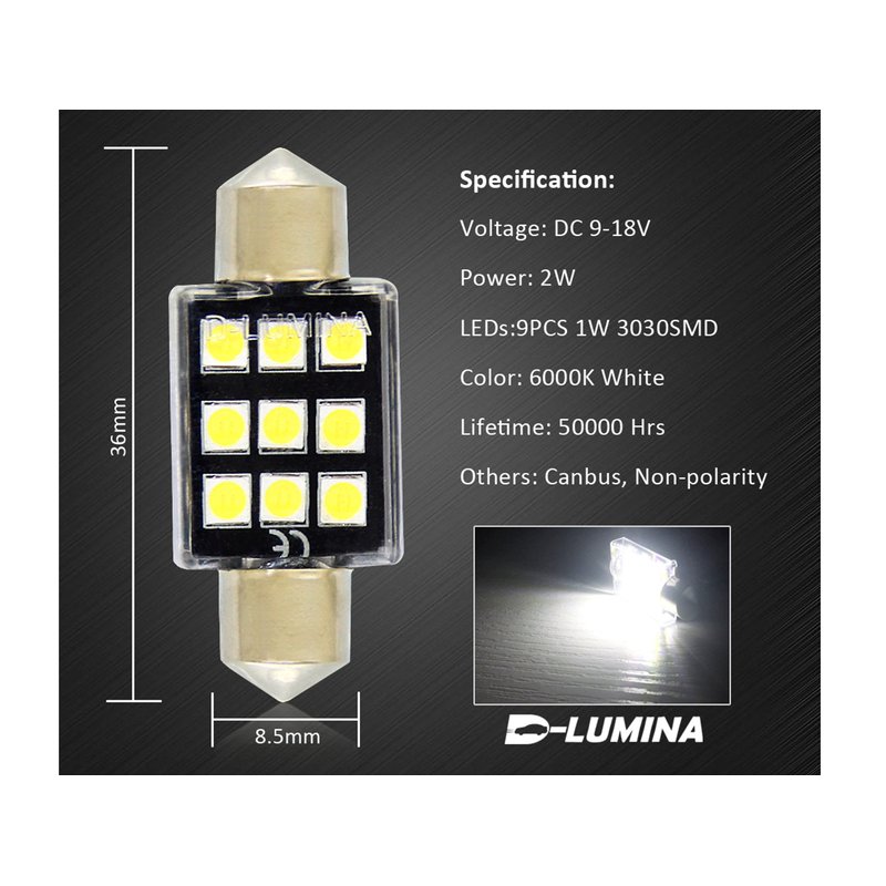 4 Lampade LED T11 Canbus 36mm 12V 2W con 6 SMD 3030 Bianco 6000K No Polarità