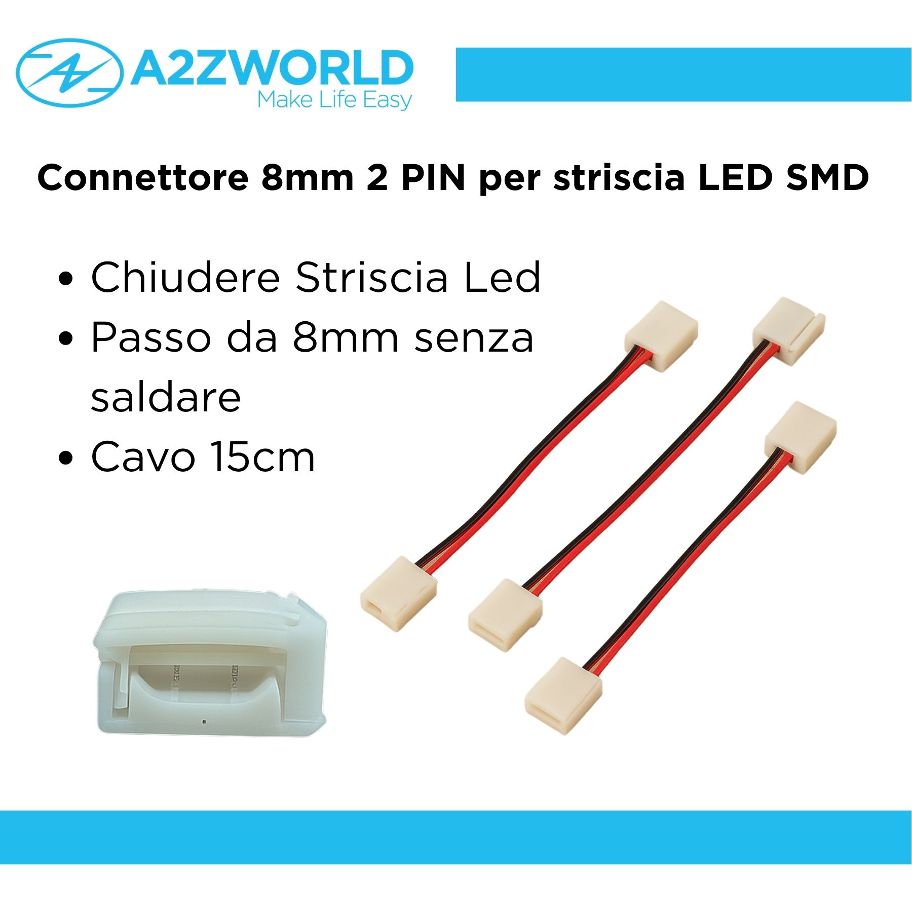 3 Pezzi Connettore 8mm 2 PIN, Per Chiudere Striscia Led Smd con Passo da 8mm Senza Saldare, Cavo 15cm
