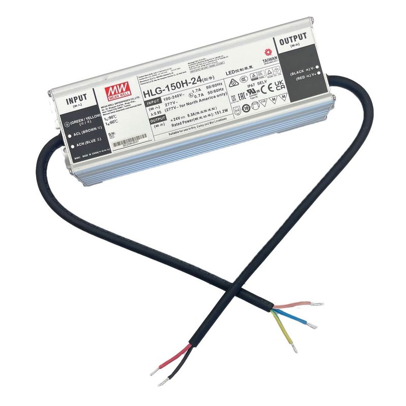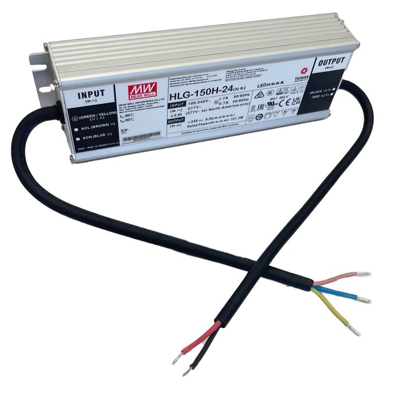 - Il MW MEAN WELL HLG-150H-24 è un alimentatore LED con uscita unica. Ha una potenza di 150W, una tensione di uscita di 24V e una corrente di uscita di 6,3A.