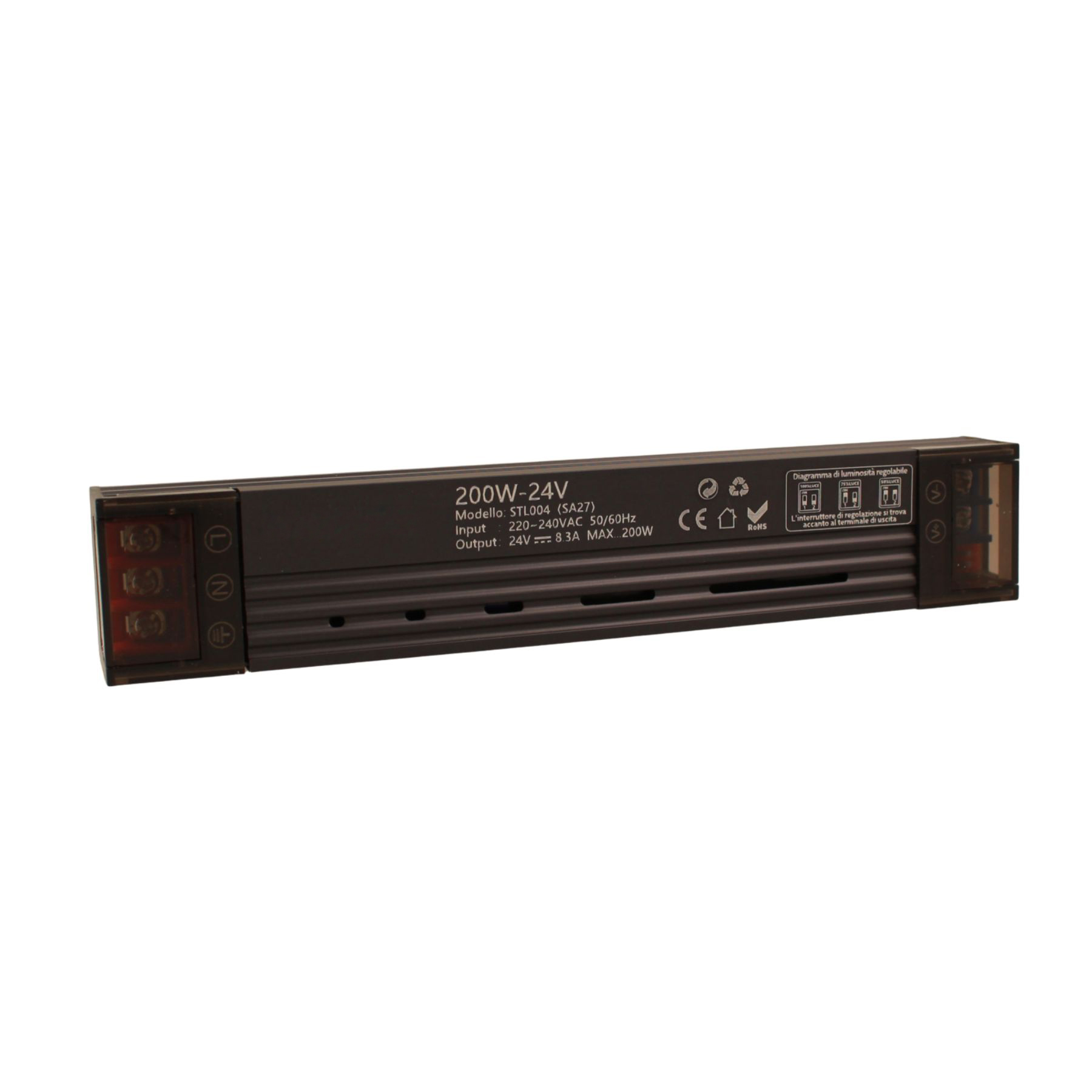 Trasformatore Alimentatore LED Slim Sottile 200W DC 24V AC 220-240V IP20 Dimmerabile a DIP con Coperchio Protezione su Morsetti 197x35x25mm