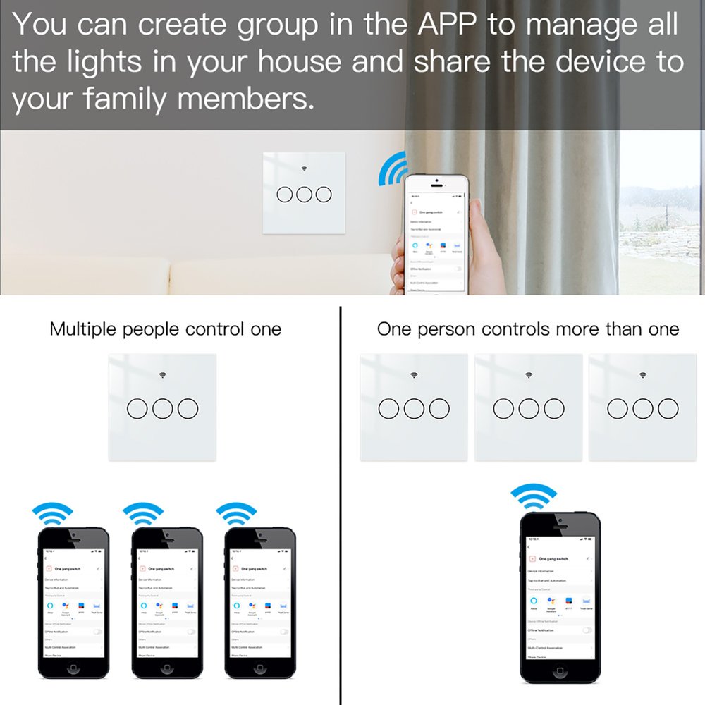 - Interruttore touch a tre tasti con connessione WiFi 2.4G e supporto Matter, per un controllo smart completo di luci e dispositivi.