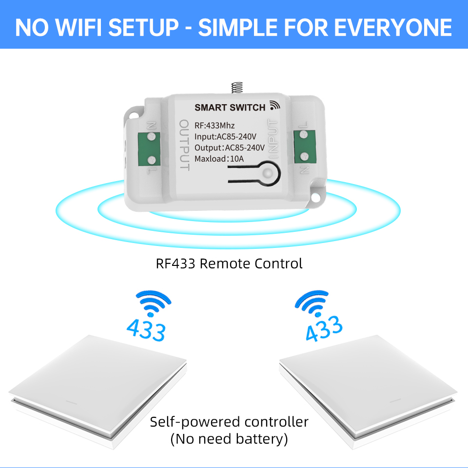 - Funzionamento via radiofrequenza a 433MHz, compatibile con ricevitori RF standard per accendere luci e dispositivi elettrici senza cablaggio