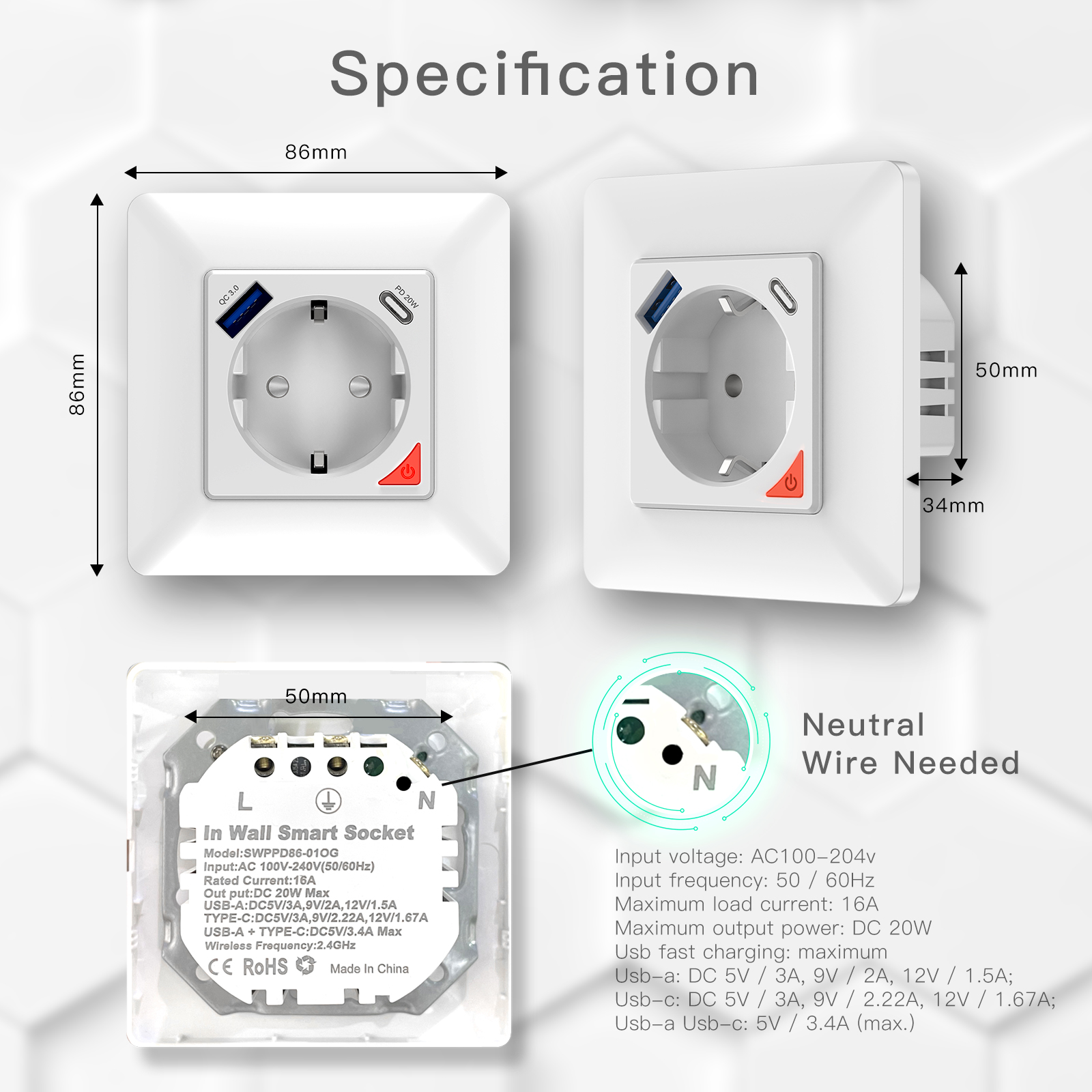 Presa Schuko Wifi Con Caricatore USB C PD 20W+ USB-A 3,0 Per Supporto Tedesco Francese 502 Italiano