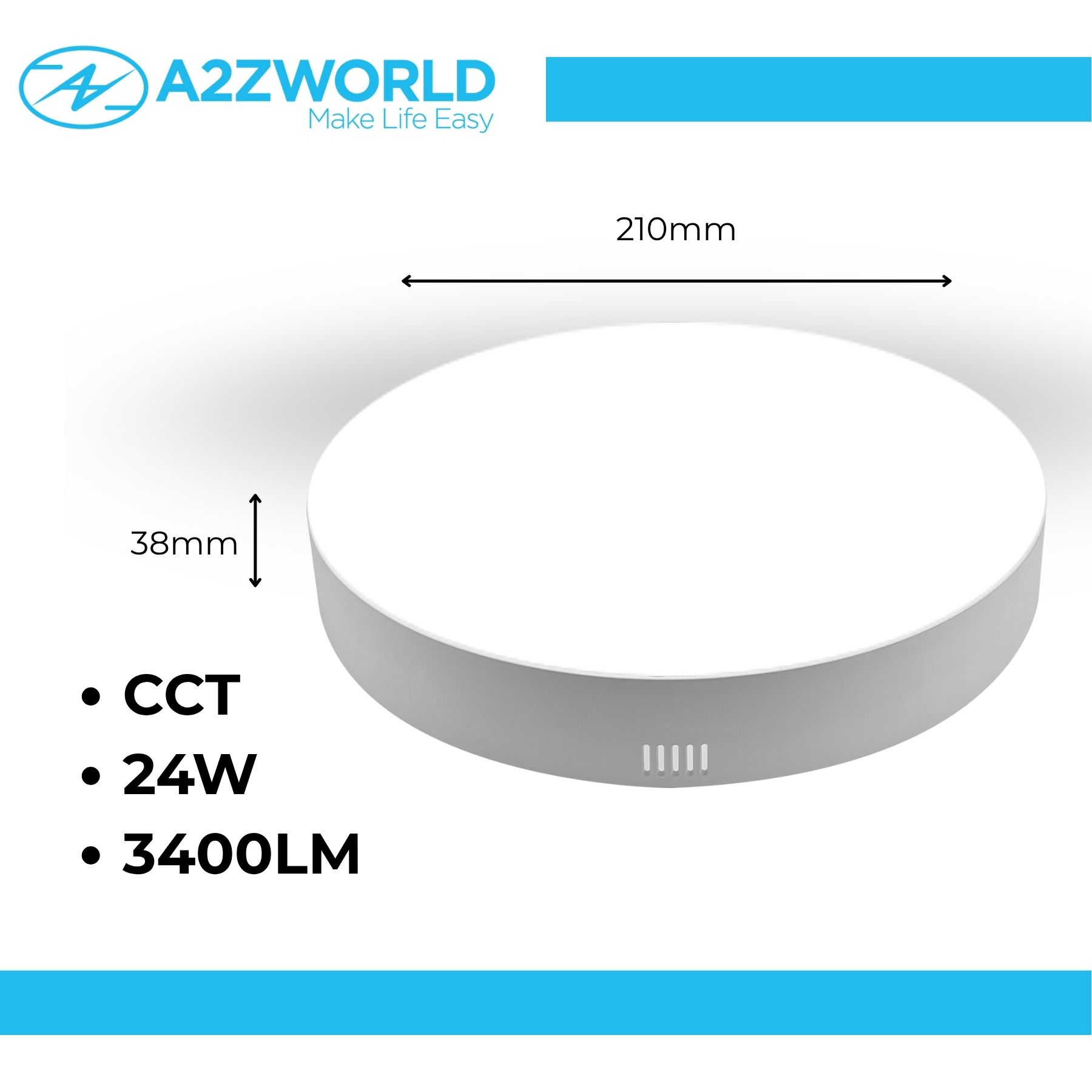 - Tre potenze e luminosità: 18W 2300lm Ø160mm, 24W 3400lm Ø210mm, 48W 6000lm Ø300mm. Tutti i modelli con angolo luce ampio 120° e resa cromatica CRI ≥80, per una luce uniforme e naturale.