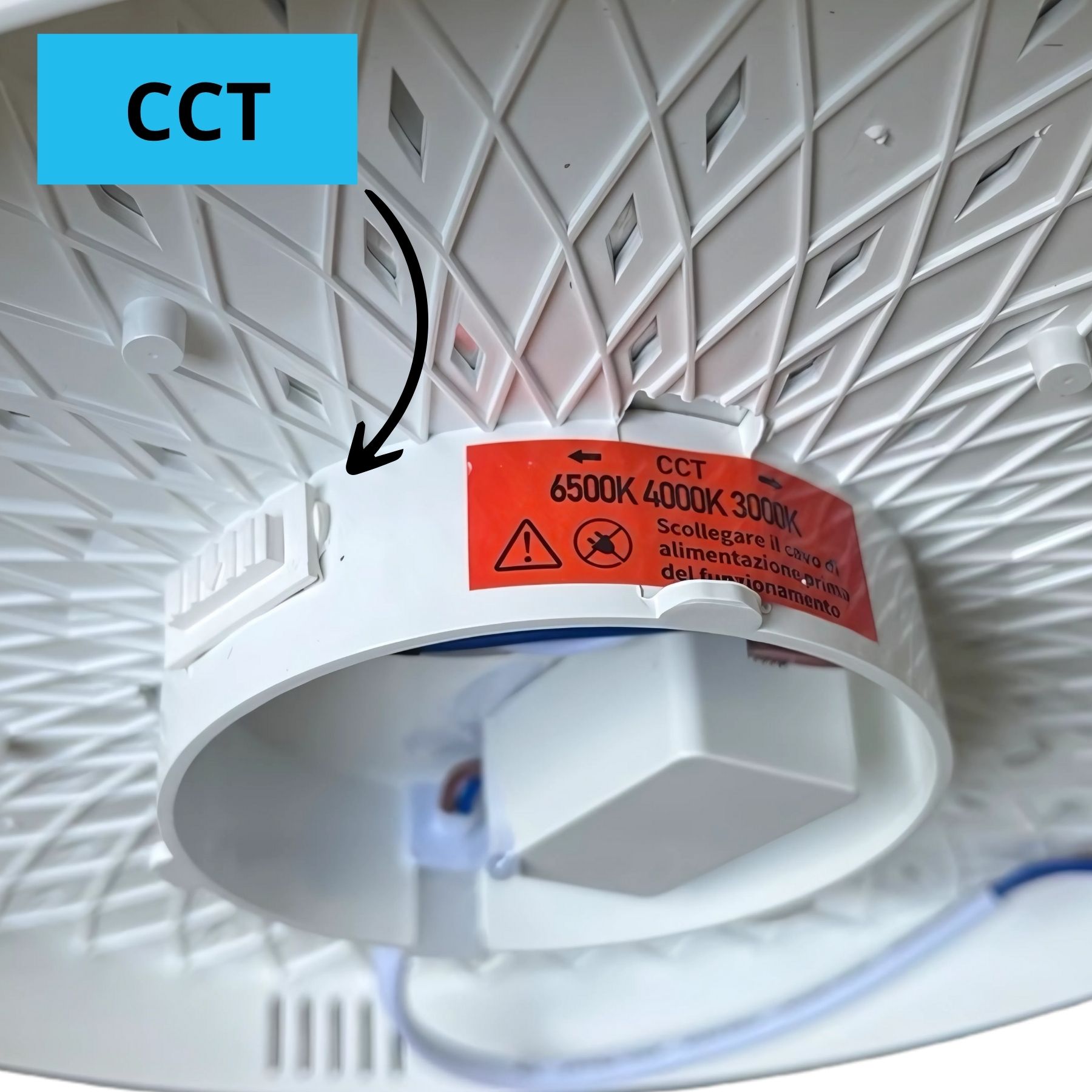 - Plafoniera LED CCT 3 in 1: selettore integrato per scegliere la temperatura colore tra luce calda 3000K, neutra 4000K o fredda 6500K, adattando l’illuminazione all’ambiente e alle esigenze di utilizzo.