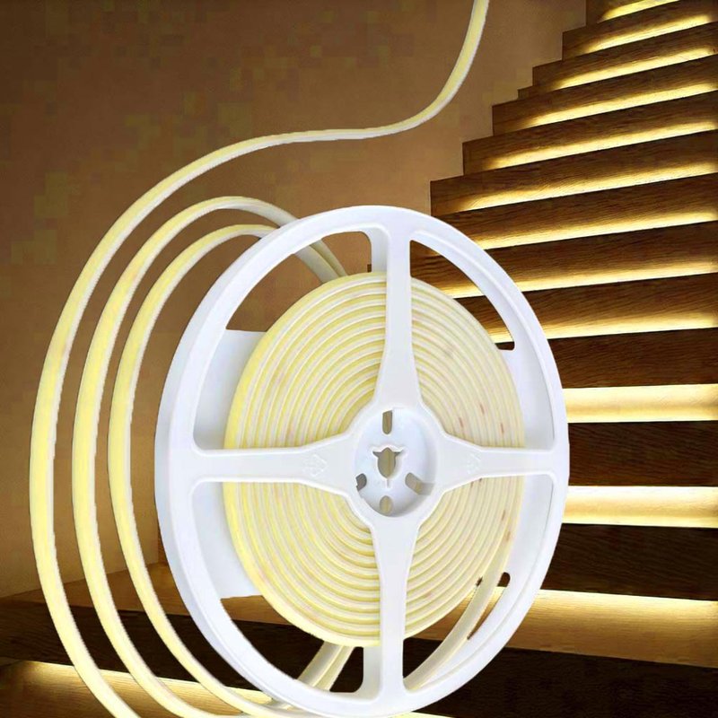 - Striscia LED COB con 320 LED per metro che produce una luce ambra intensa e continua, perfetta per ricreare atmosfere calde e vintage