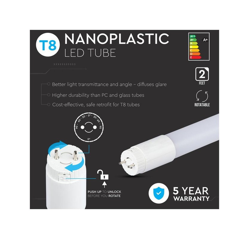 Tubo Led T8 G13 60cm 9W 850LM 3000K Alimentazione da Un Lato Non Ruotabile SKU-216392