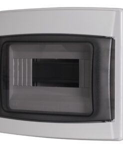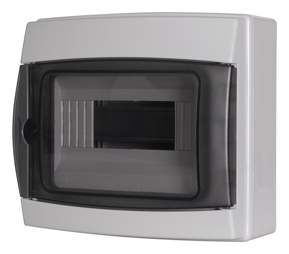 Centralino da parete 8 moduli con portello fumé, grigio RAL 7035, 200x180x100 mm, IP65, ideale per installazioni elettriche interne ed esterne