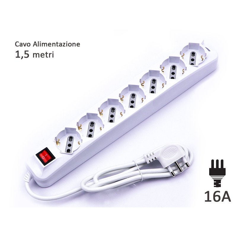 Multipresa Ciabatta Elettrica 7 Posti 10/16A Schuko Cavo 1,5 Metri Max 3500W Spina 16A Laterale SKU-8714