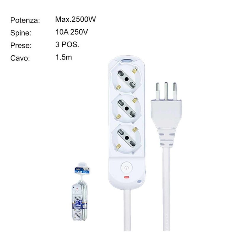 Cavo di Alimentazione Bianco 1.5 metri: Il cavo di alimentazione bianco lungo 1.5 metri offre flessibilità nella disposizione della ciabatta elettrica, si adatta a diverse disposizioni negli ambienti domestici o uffici, mantenendo un’elegante estetica bianca.
