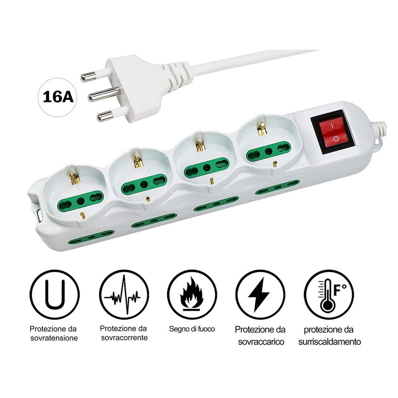 Multipresa Ciabatta Elettrica Cavo 1,5M Con 12 Posti 4 Prese Schuko 10/16A + 8 Prese Bipasso 2P+T 10/16A Interruttore