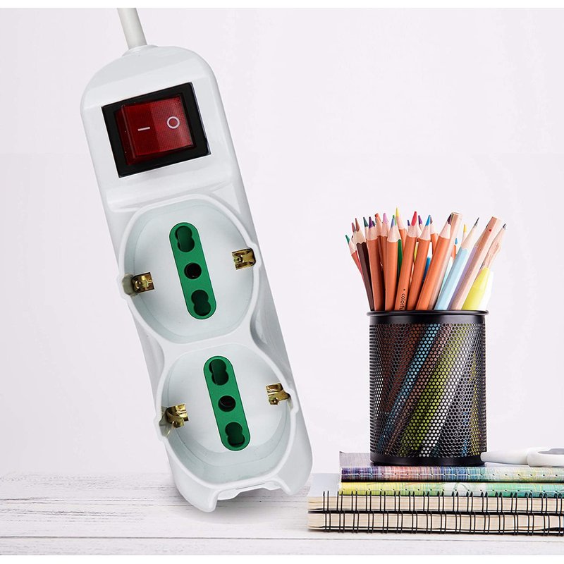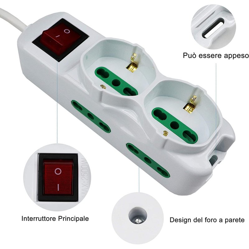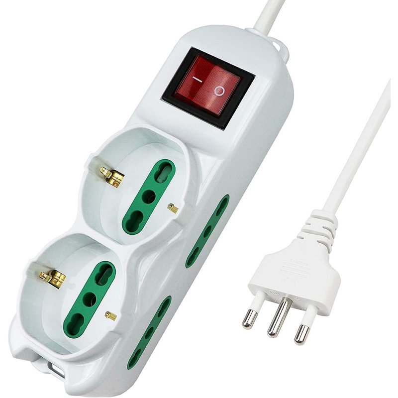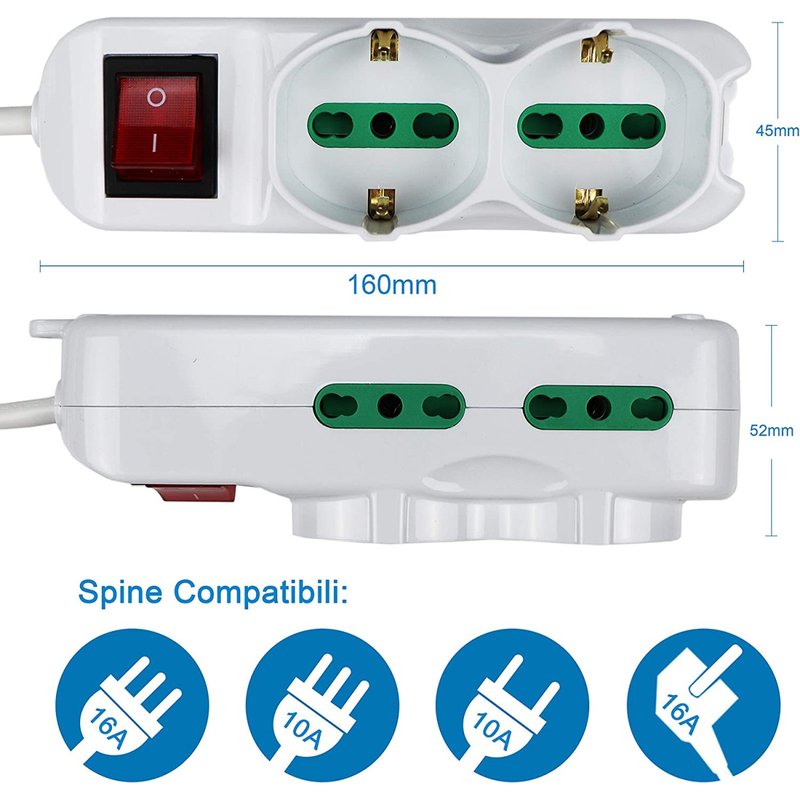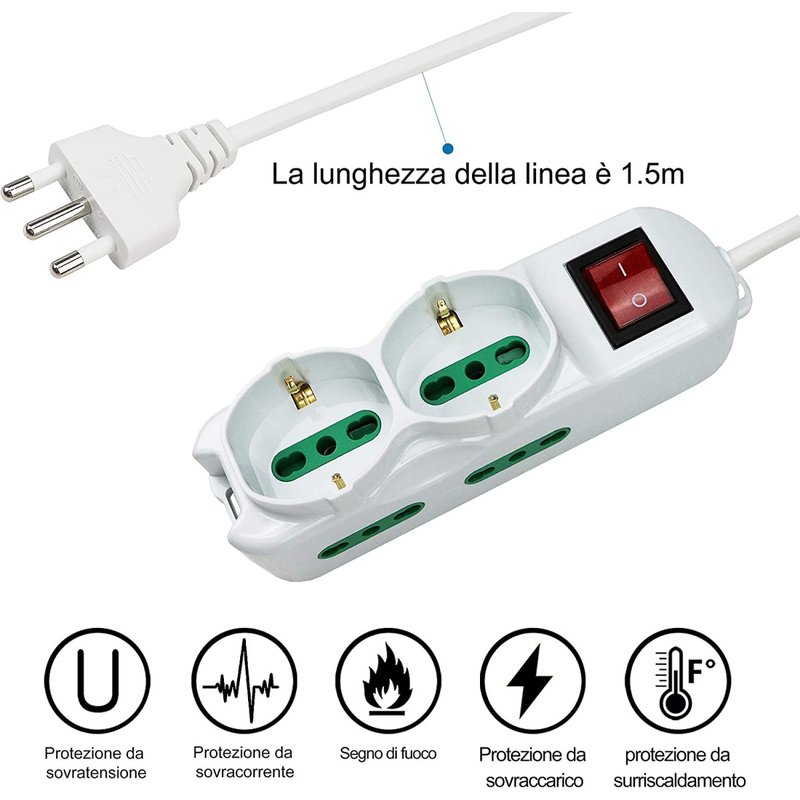 Multipresa Ciabatta Elettrica Cavo 1,5M Con 6 Posti 2 Prese Schuko 10/16A + 4 Prese Bipasso 2P+T 10/16A Interruttore