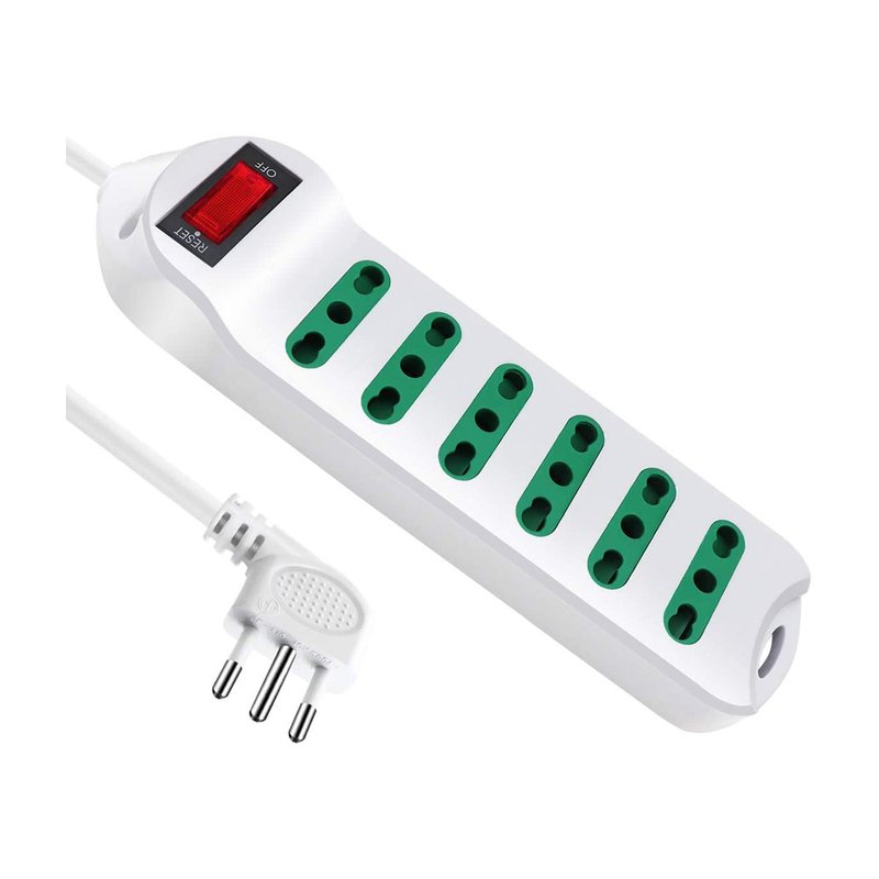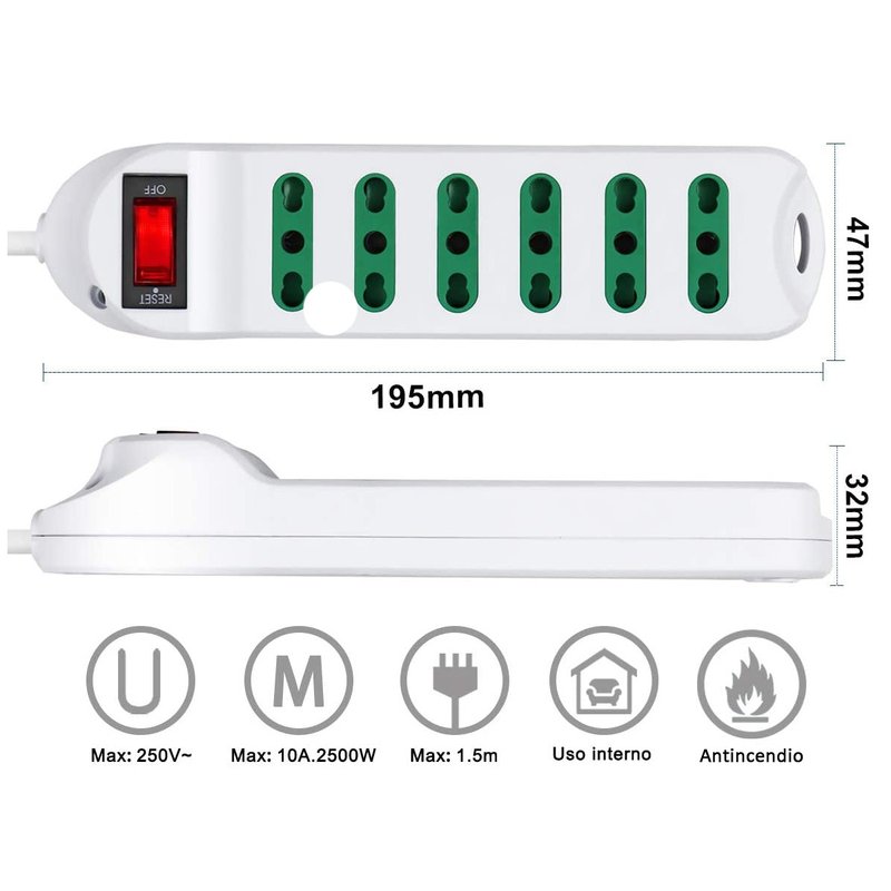 Multipresa Ciabatta Elettrica Cavo 3M Con 6 Posti Prese Bipasso 10/16A 2P+T Interruttore Spina 10A Laterale