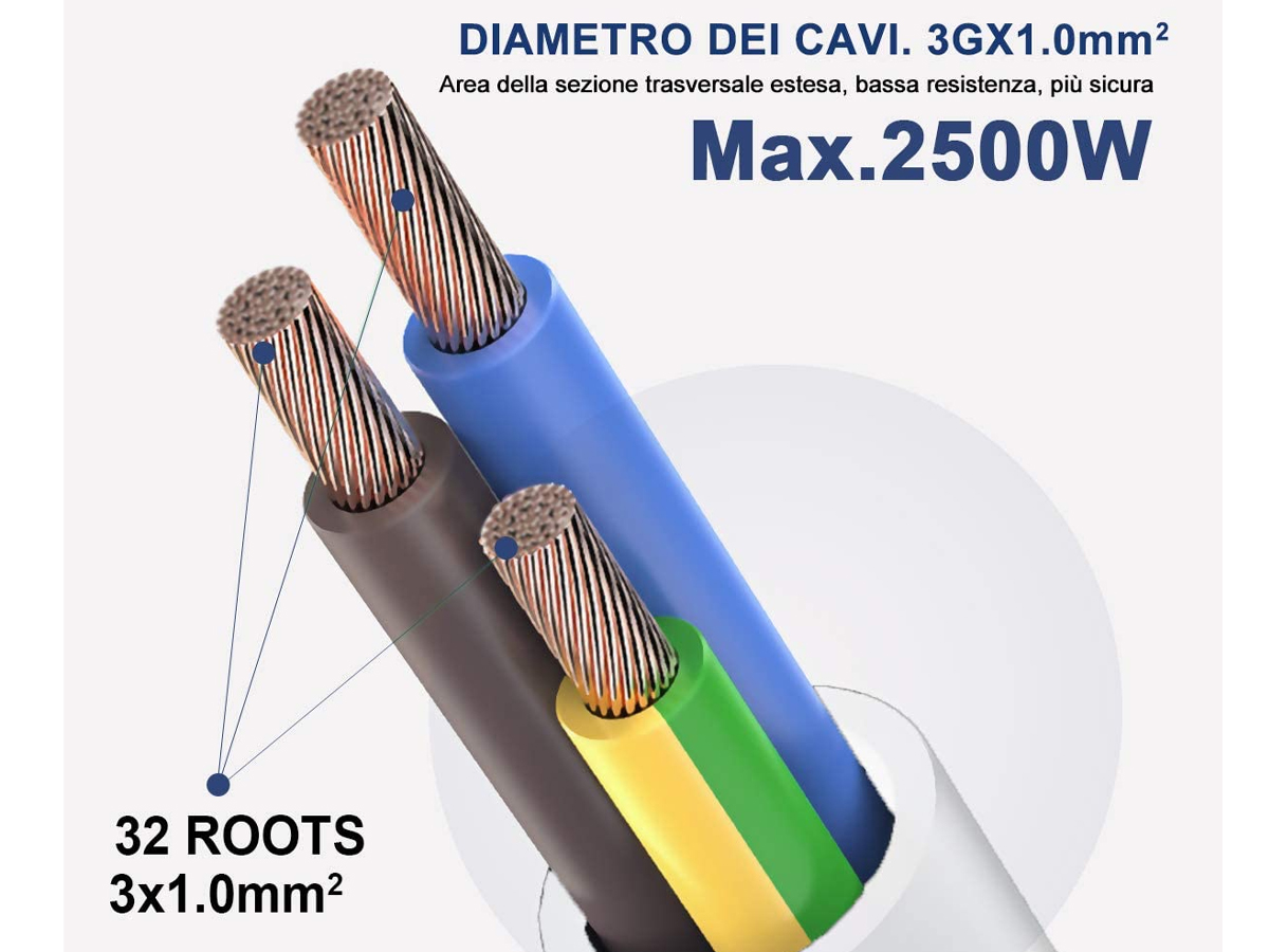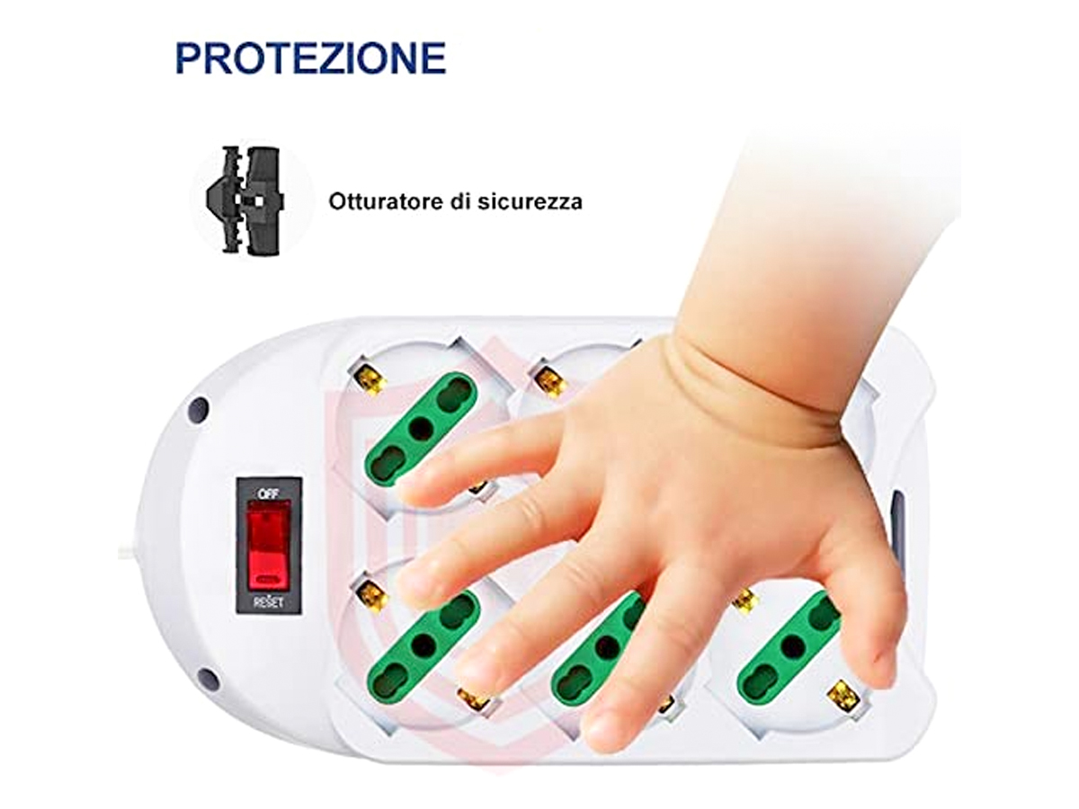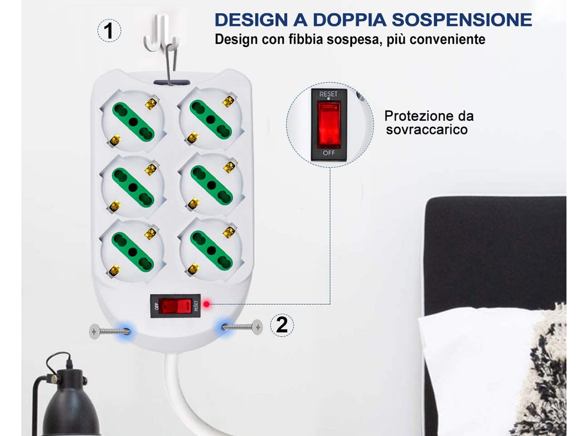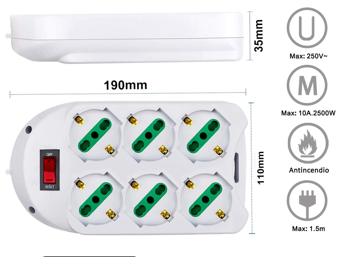 Multipresa Ciabatta Elettrica Con 6 Prese Schuko 10/16A Interruttore Spina 10A Laterale Cavo 1,5M Bianco