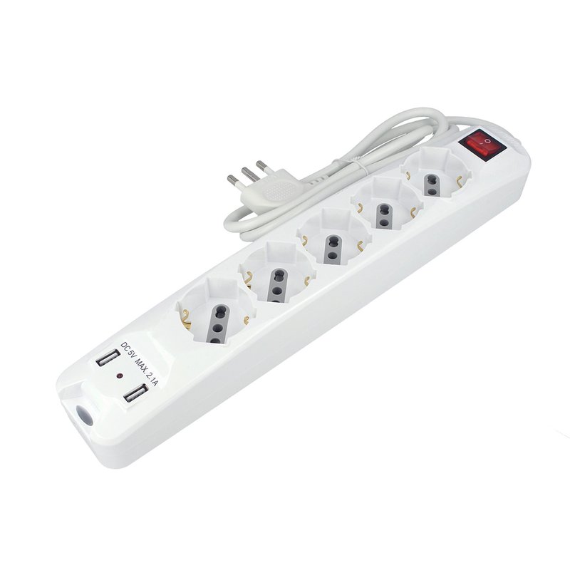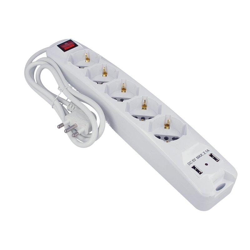 Multipresa Ciabatta Elettrica Spina Con 2 USB 2,1A Cavo 1,5 Metri 5 Posti 2P+T 10/16A Bipasso Schuko Con Interruttore SKU-8715
