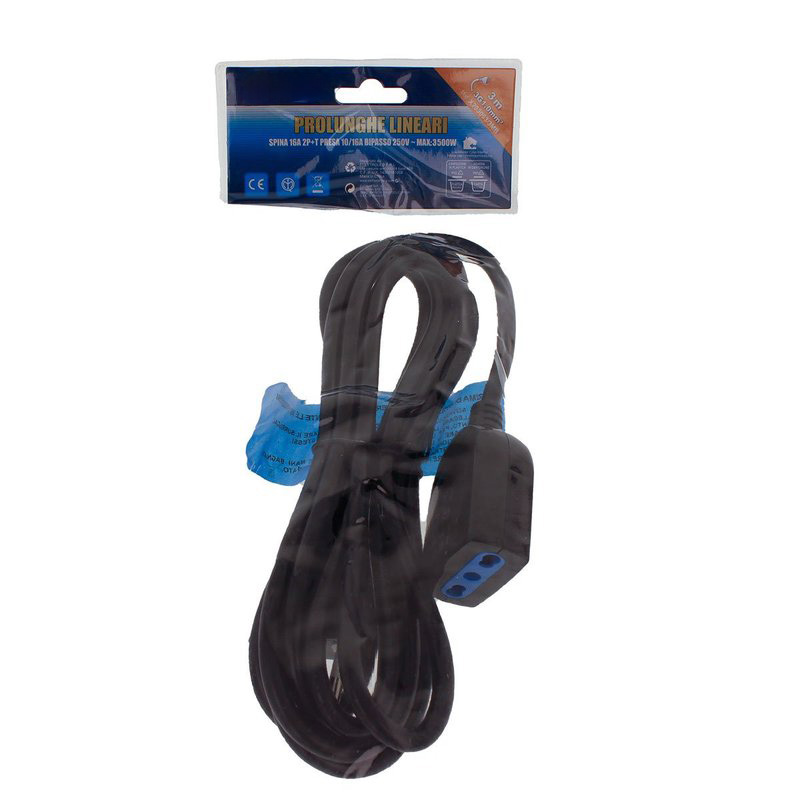 Prolunga Lineare Colore Nero 3M 3X1.0mm Spina Italiana 16A Presa Bipasso 10/16A Max 3500W