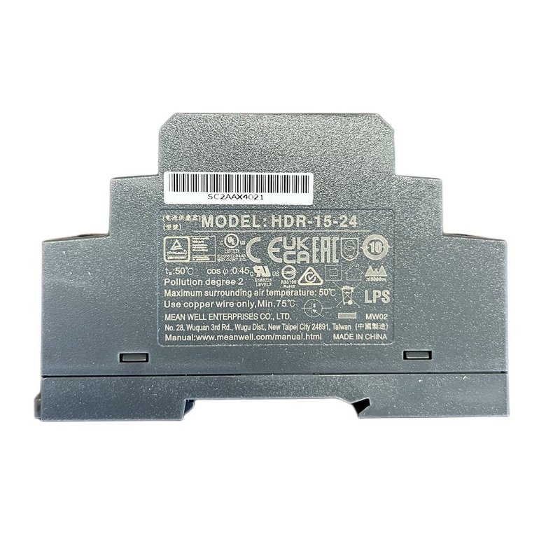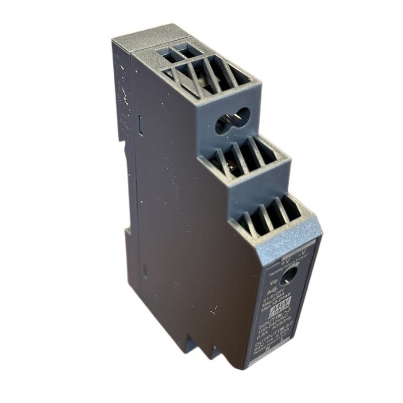 - Alimentatore switching da 15W con uscita a 24V 0.63A, design ultra slim di soli 17.5mm, ideale per installazione su guida DIN TS-35/7.5 o 15