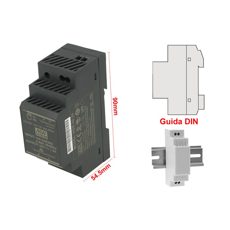 - Alimentatore switching industriale da 36W con uscita a 24V 1.5A, design compatto ultra slim da 35mm, ideale per installazione su guida DIN TS-35/7.5 o 15