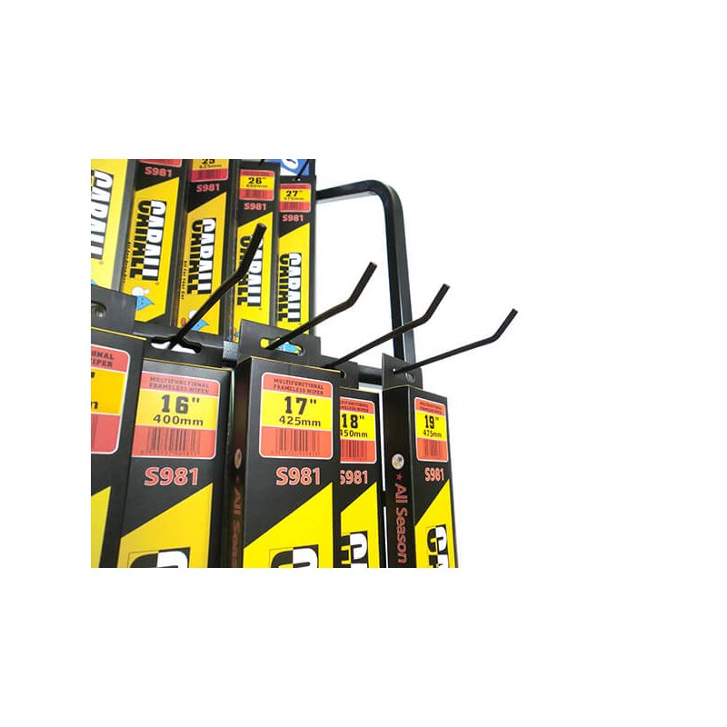 - Espositore professionale: Struttura dedicata per spazzole tergicristallo auto, con 2 livelli e 16 ganci.