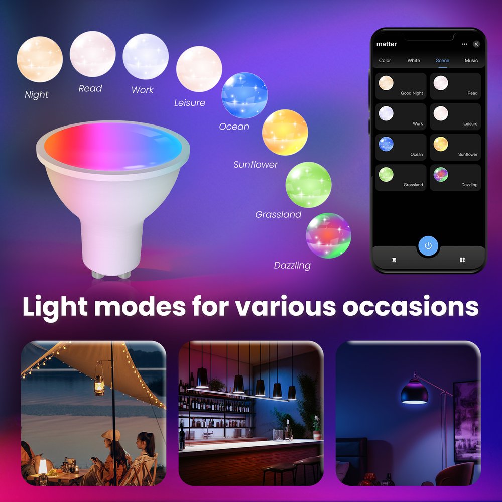 - Lampada LED GU10 con tecnologia Matter e WiFi 2.4G, progettata per un controllo smart avanzato e compatibile con i principali ecosistemi domotici.