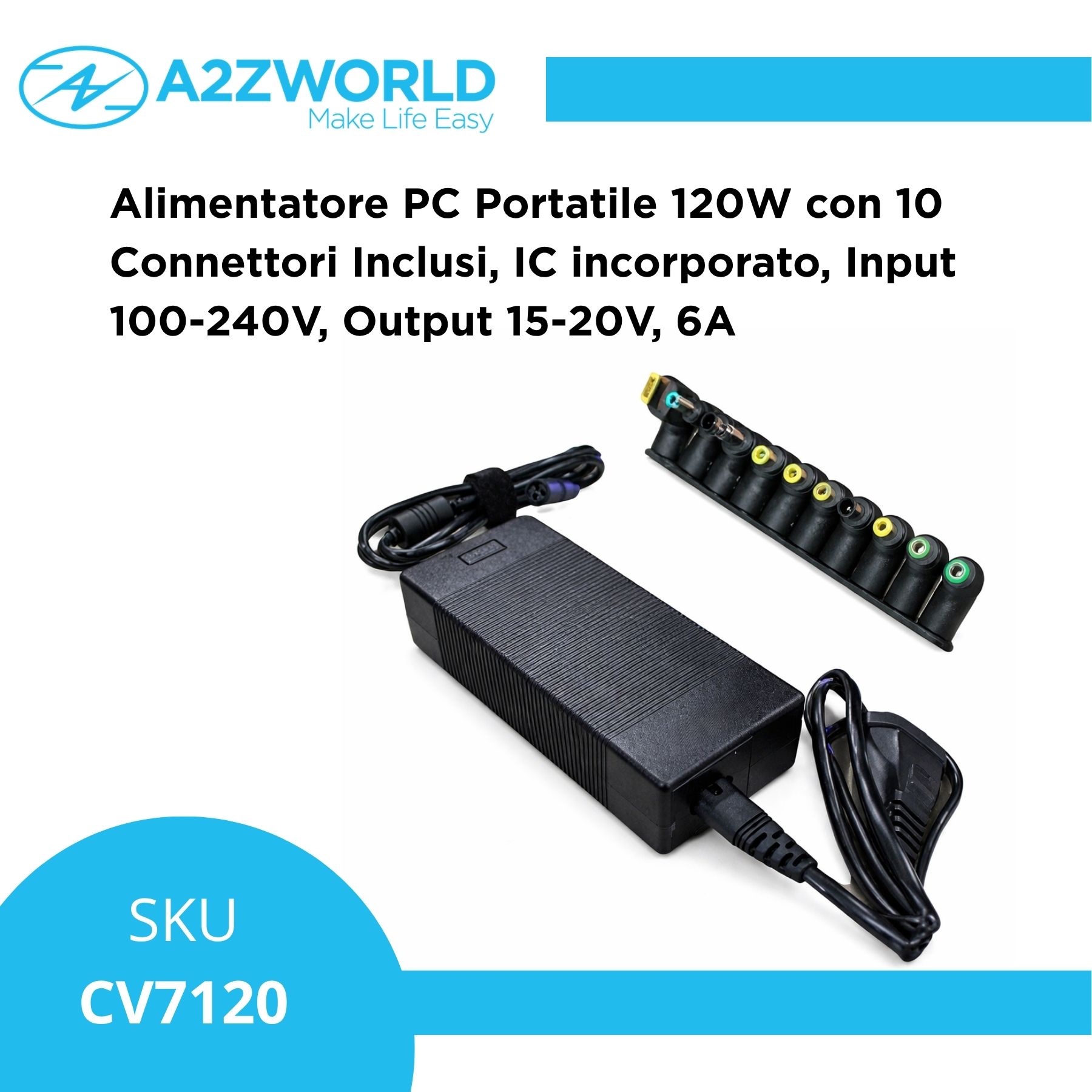 Alimentatore Universale Laptop 120W, Output 15–20V 6A, 10 Connettori