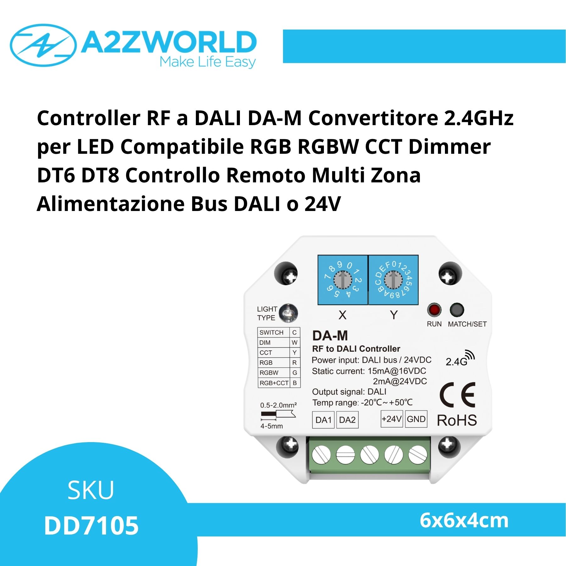 Controller RF a DALI DA-M Convertitore 2.4GHz per LED Compatibile RGB RGBW CCT Dimmer DT6 DT8 Controllo Remoto Multi Zona Alimentazione Bus DALI o 24V