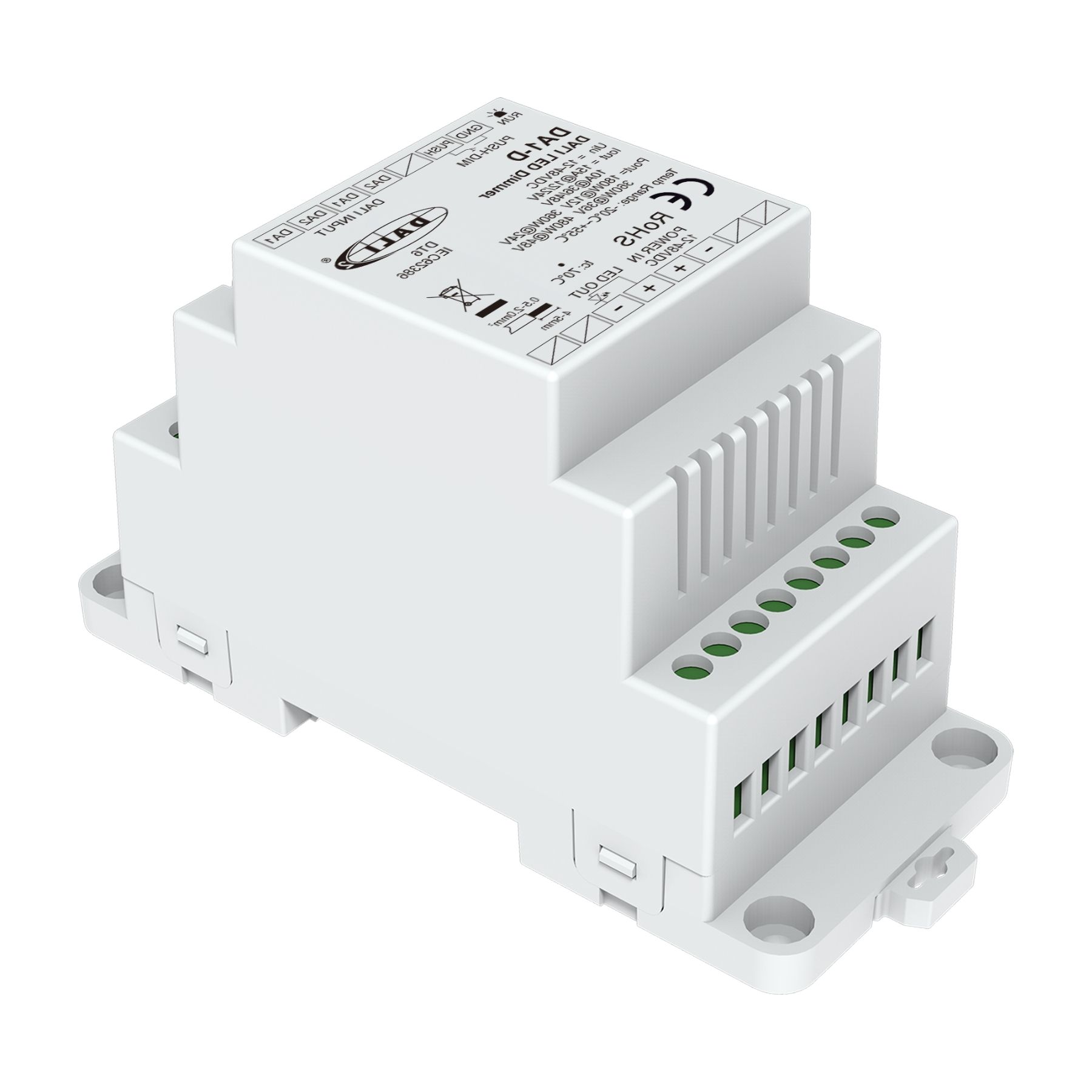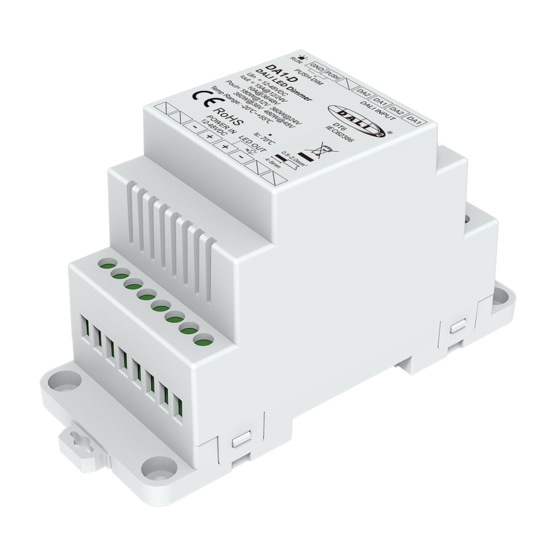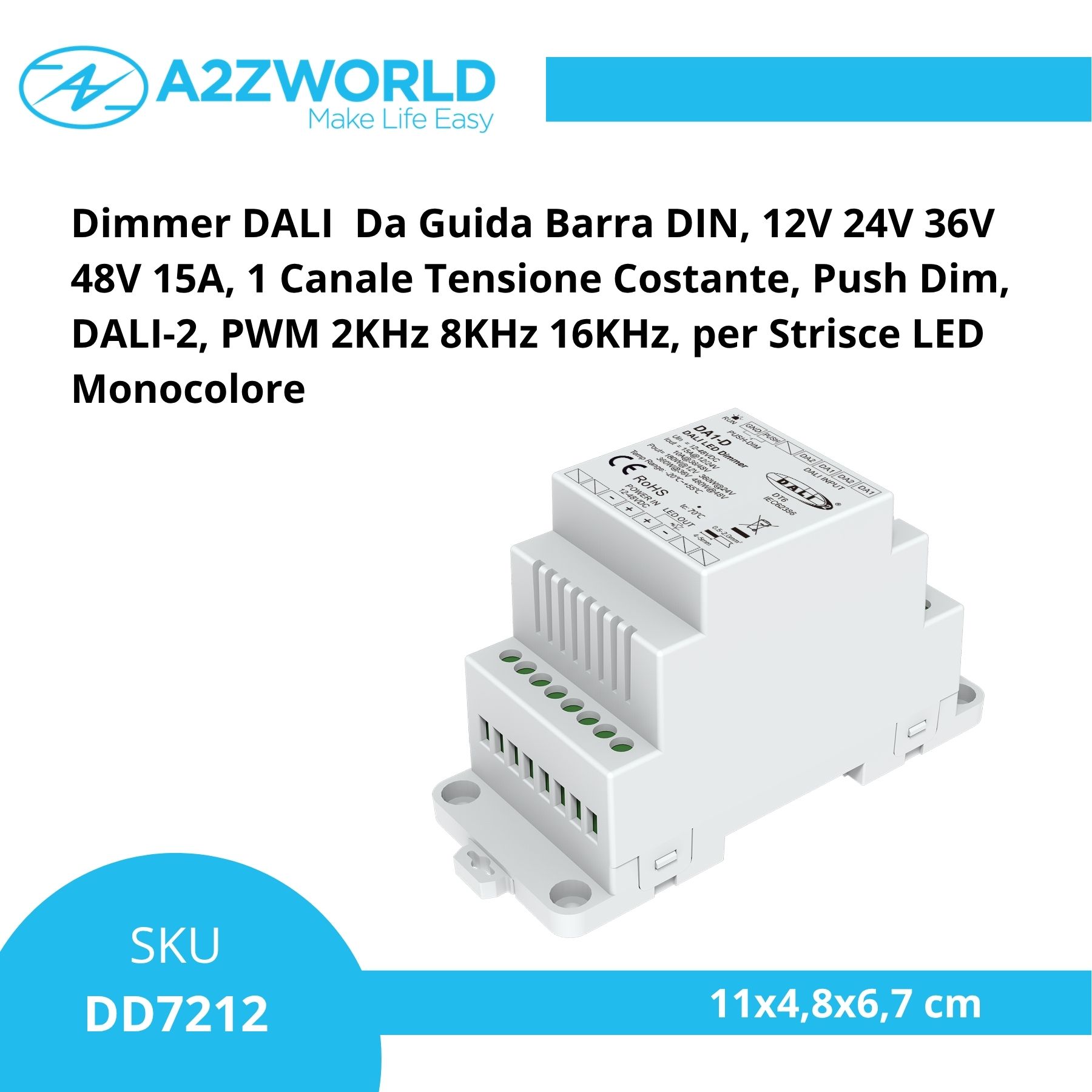 - Installazione su guida DIN con alimentazione 12-48VDC e ingresso Push Dim