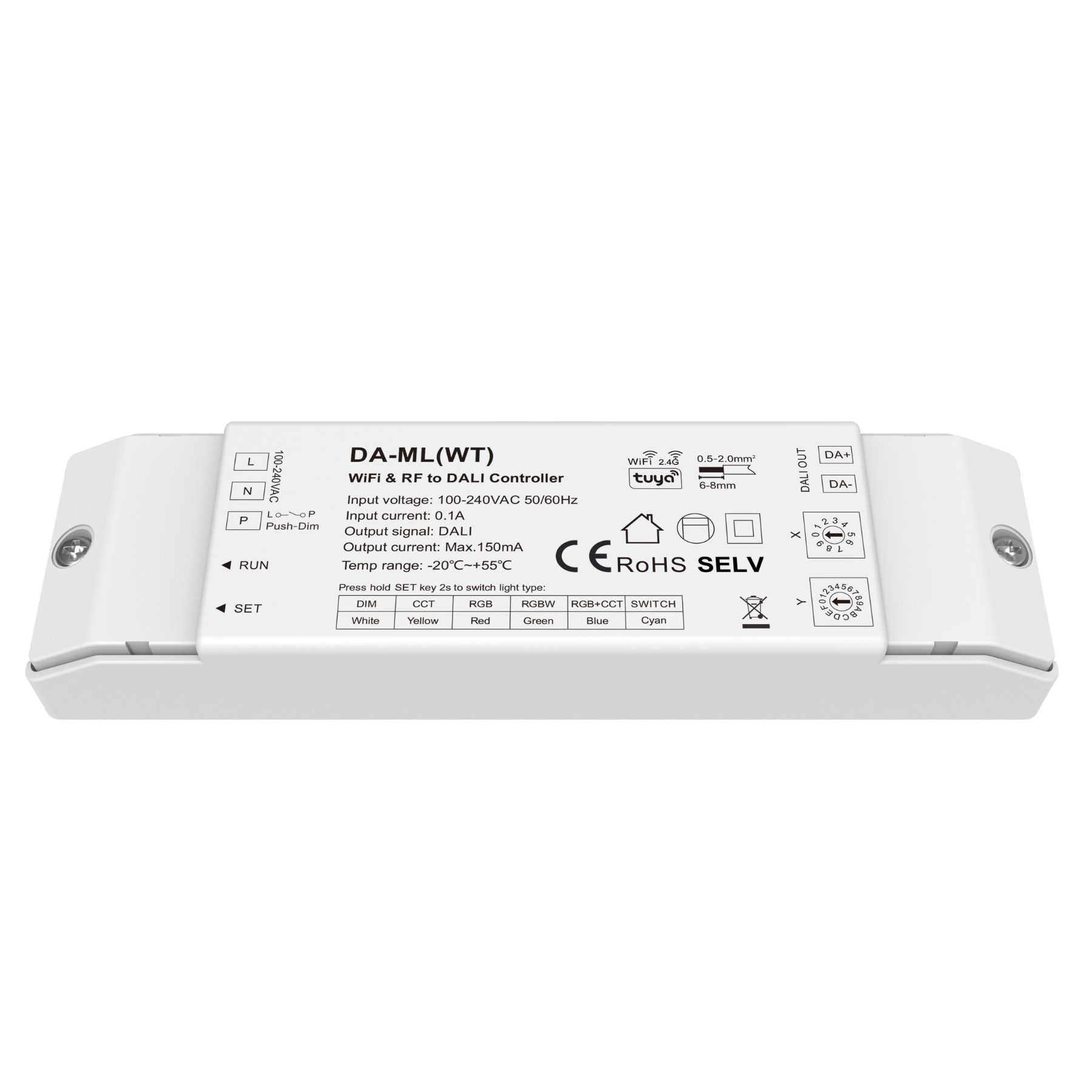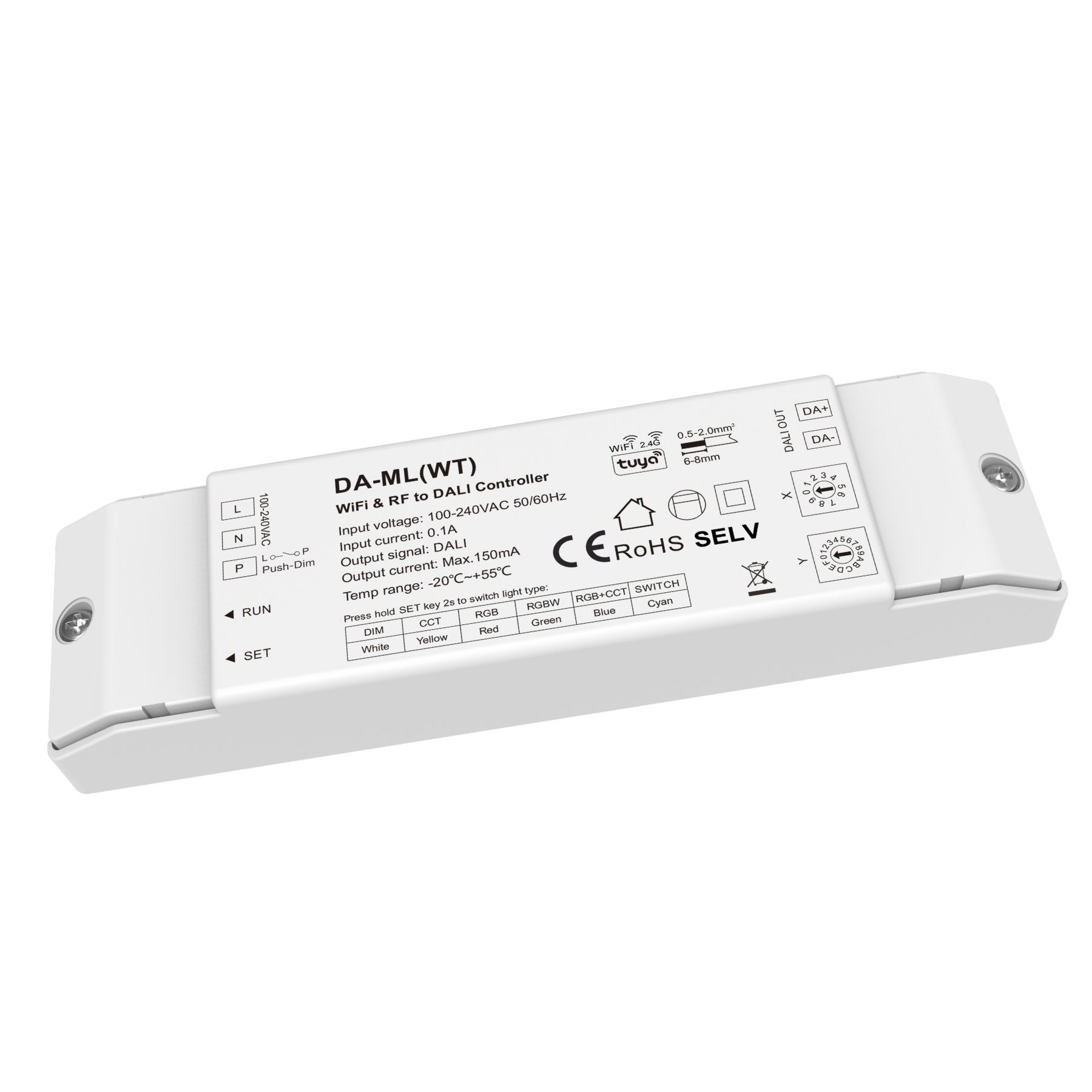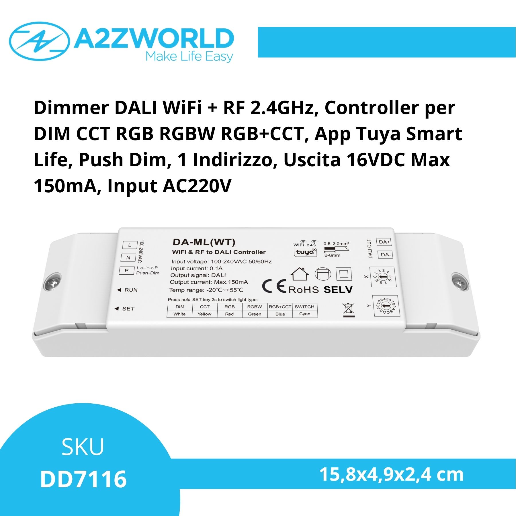 - Compatibile con dispositivi DALI DT6 e DT8 (DIM, CCT, RGB, RGBW, RGB+CCT)
