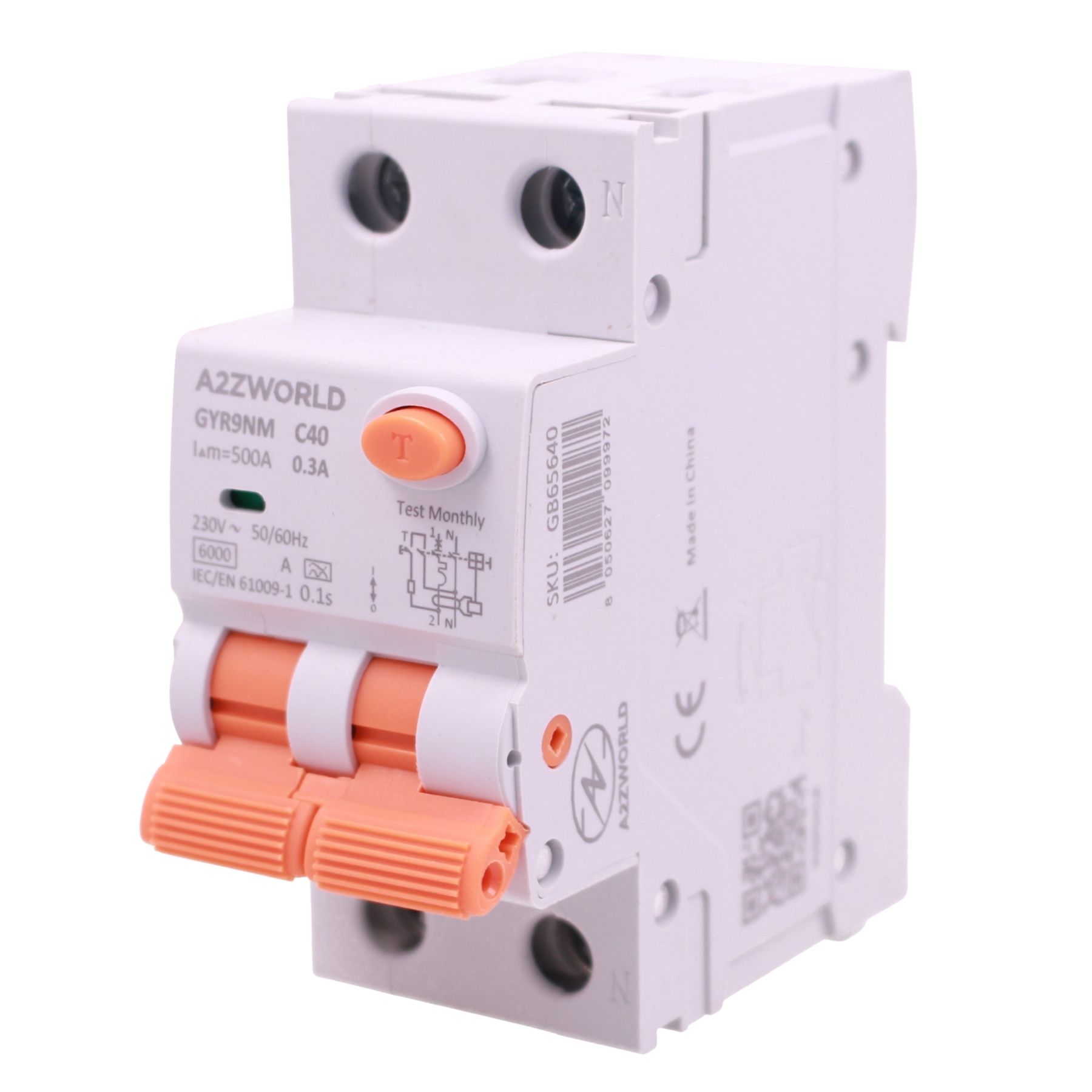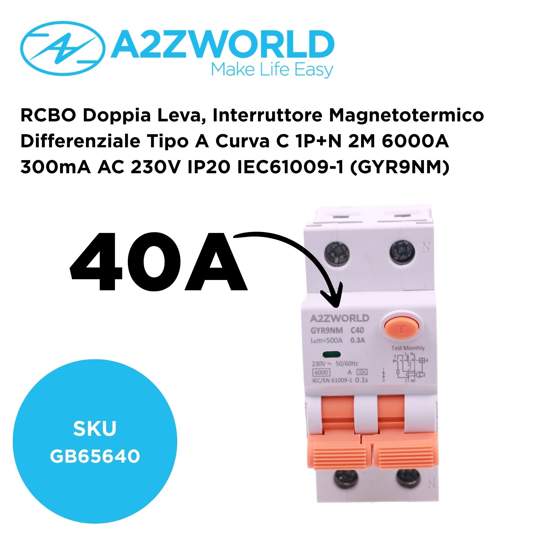 RCBO Doppia Leva, Interruttore Magnetotermico Differenziale Tipo A Curva C 1P+N 2M 6000A 300mA AC 230V IP20 IEC61009-1 GYR9NM, Disponibili 40A 50A 63A (C40A)