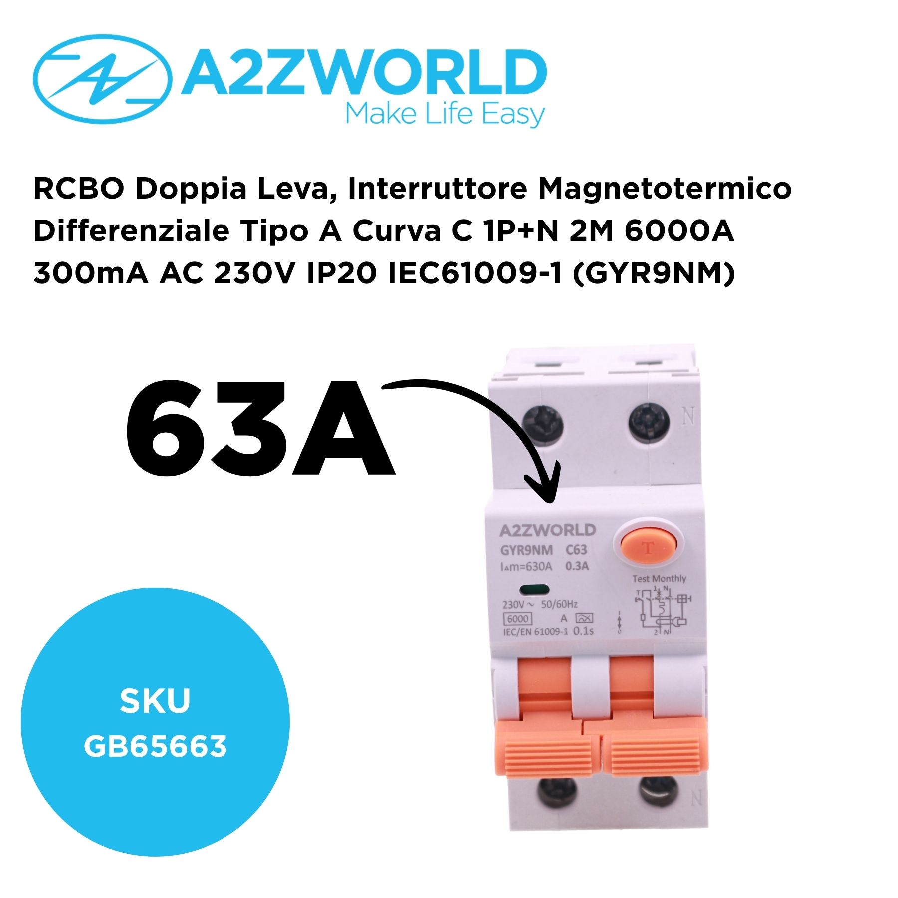 RCBO Doppia Leva, Interruttore Magnetotermico Differenziale Tipo A Curva C 1P+N 2M 6000A 300mA AC 230V IP20 IEC61009-1 GYR9NM, Disponibili 40A 50A 63A (C63A)
