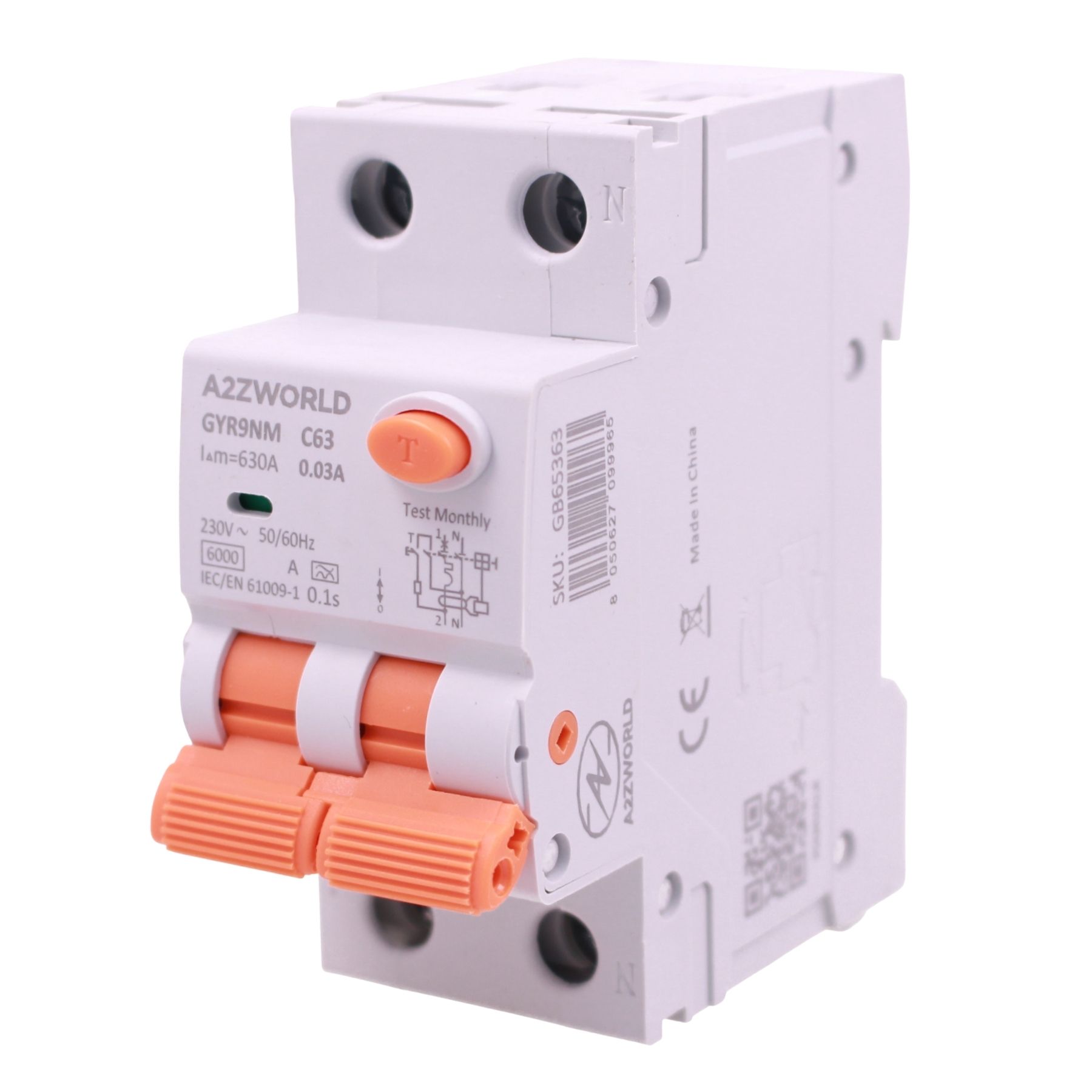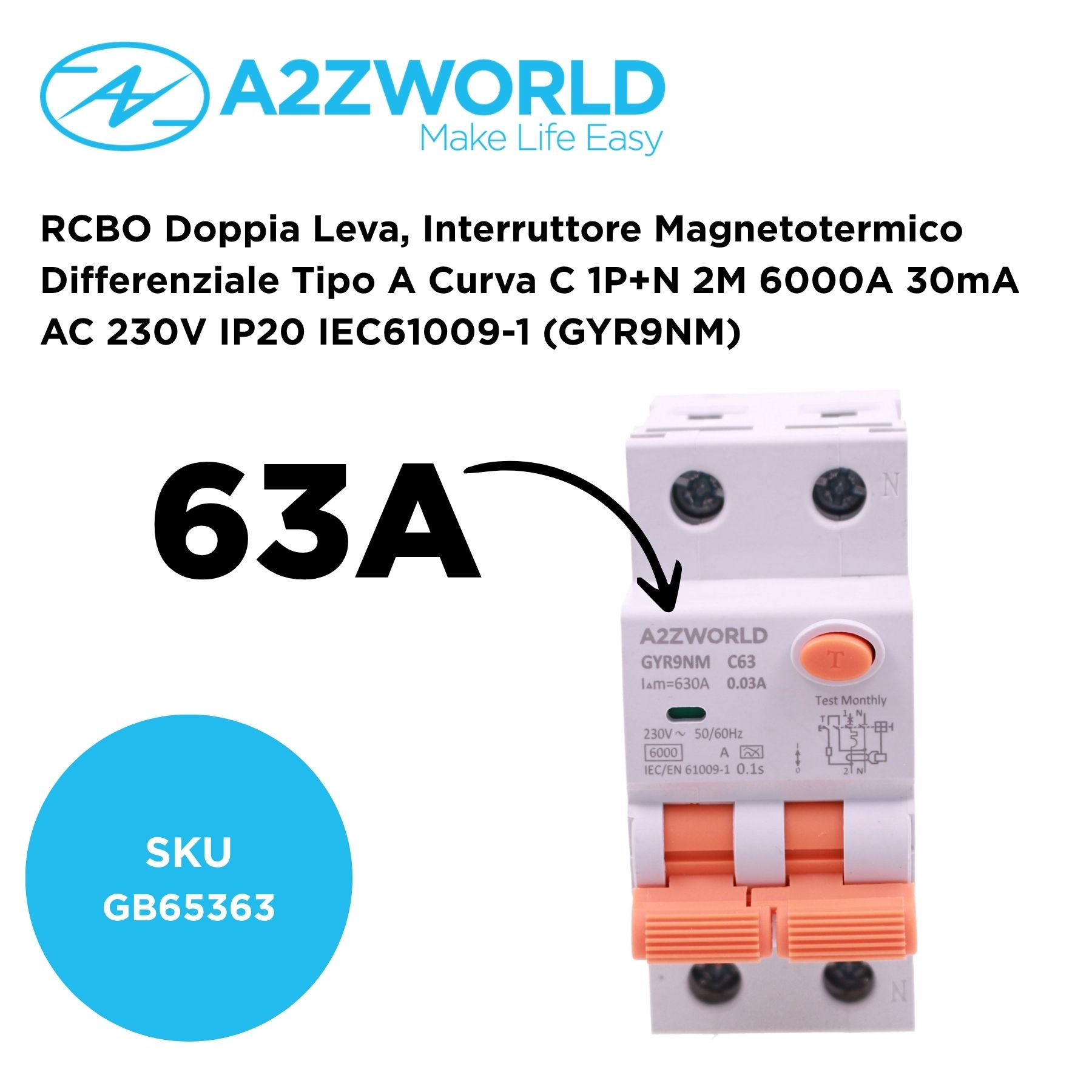 RCBO Doppia Leva, Interruttore Magnetotermico Differenziale Tipo A Curva C 1P+N 2M 6000A 30mA AC 230V IP20 IEC61009-1 GYR9NM, Disponibili 40A 50A 63A (C63A)
